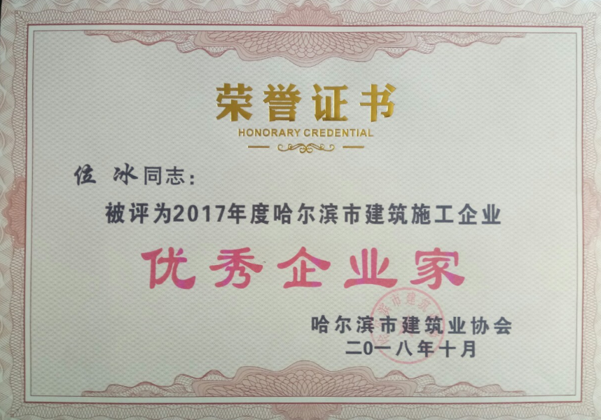 近日,哈尔滨市建筑业协会对外公布了2017年度哈尔滨市建筑施工“二十佳”企业、“******企业家”、“******建造师”名单,黑龙江垦区龙垦建设工程总公司入围并斩获了“二十佳”企业、“******企业家”、 “******建造师”等三项殊荣。