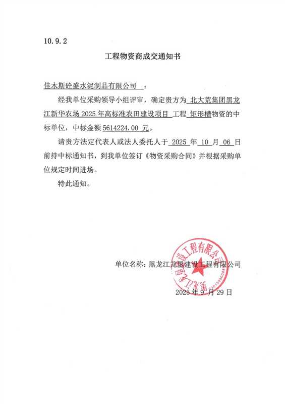 北大荒集团黑龙江新华农场2025年高标准农田建设项目矩形槽物资商成交通知书