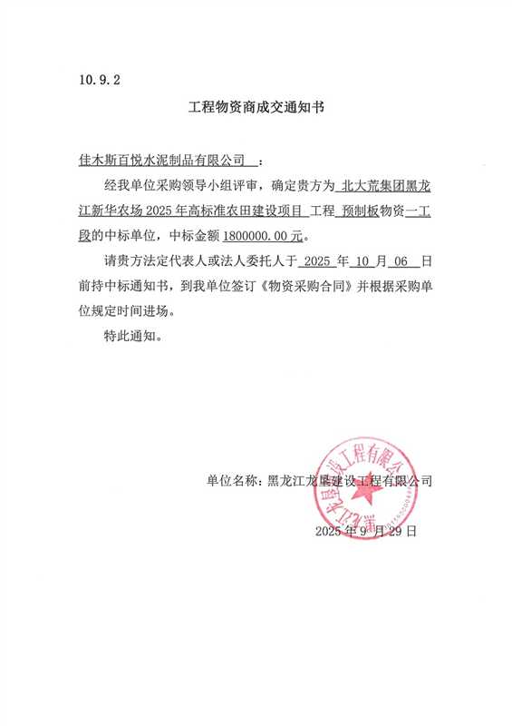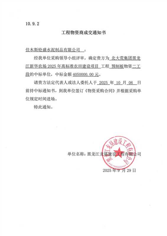 北大荒集团黑龙江新华农场2025年高标准农田建设项目预制板物资商成交通知书