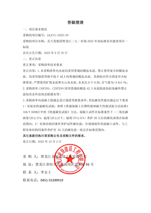 北大荒集团黑龙江二九一农场2025年高标准农田建设项目一标段混凝土采购答疑澄清