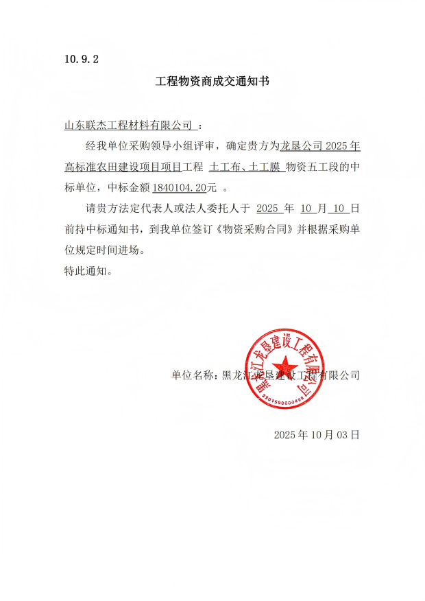 龙垦公司2025年高标准农田建设项目土工布、土工膜物资成交通知书(二)