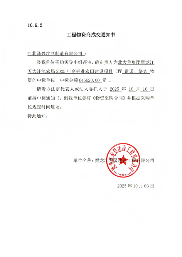 北大荒集团黑龙江五大连池农场2025年高标准农田建设项目雷诺、格宾物资成交通知书