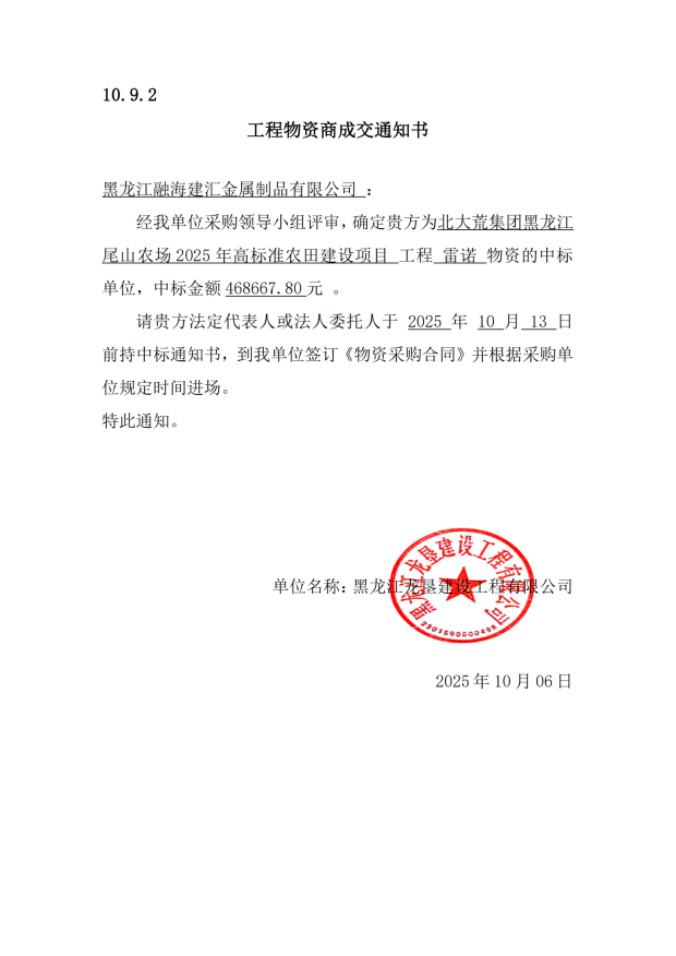北大荒集团黑龙江尾山农场2025年高标准农田建设项目雷诺物资成交通知书