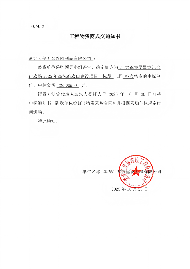 北大荒集团黑龙江尖山农场2025年高标准农田建设项目一标段格宾物资成交通知书