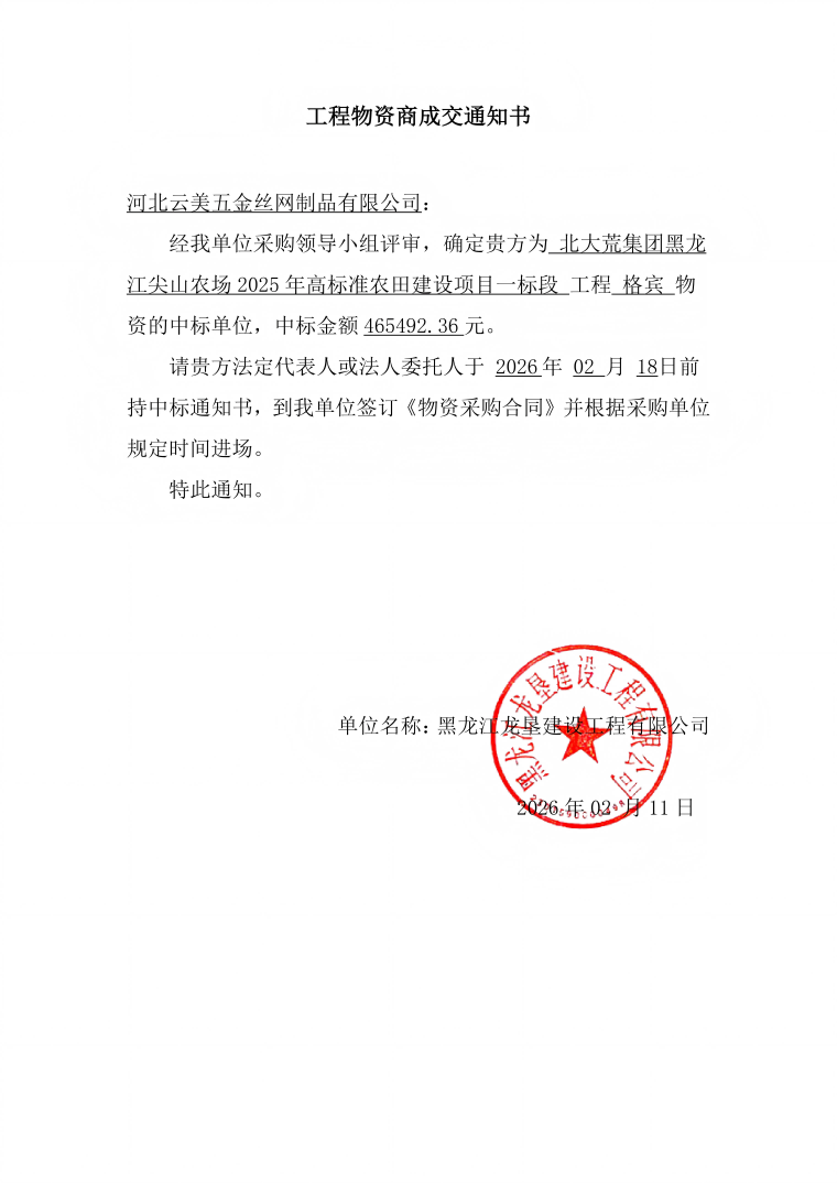 北大荒集团黑龙江尖山农场2025年高标准农田建设项目一标段格宾物资成交通知书